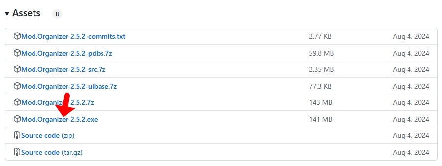 아래 버튼을 클릭하신 다음 쭉 내려서 Assets에서 Mod.Organizer-x.x.x.exe를 클릭해서 다운로드 해주세요.