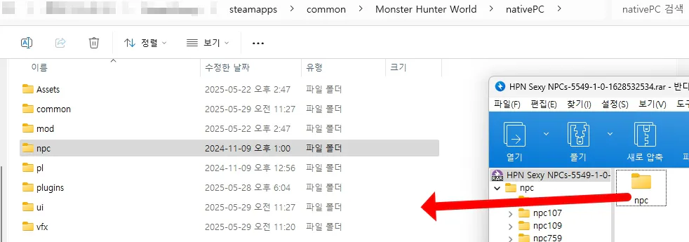 다운 받은 압축 파일을 열고 npc 폴더를 아래 경로에 넣어주시면 끝입니다! 🙂