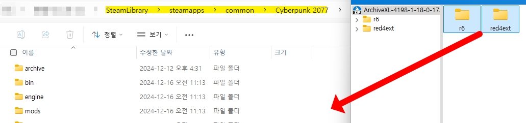 1. 다운로드 된 압축 파일을 열고 아래 경로에 r6 폴더와 red4ext 폴더를 넣어주세요.
