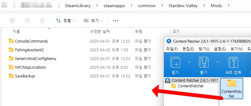 다운 받은 압축 폴더를 열고 Content Patcher 파일을 아래 경로에 넣으시면 끝이에요.