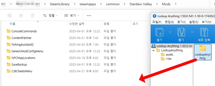 다운 받은 압축 폴더를 열고 LookupAnything 폴더를 아래 경로에 넣으시면 끝이에요.
