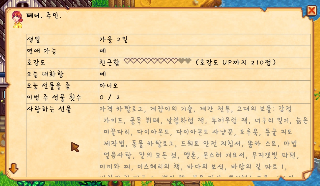 마을 사람이 좋아하는 선물, 작물 수확 시기, 울타리 수명 등 다양한 정보를 실시간으로 볼 수 있는 모드에요 🙂