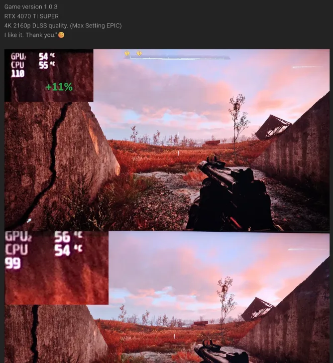 글카 4070TI 슈퍼 / 4K 99프레임에서 110프레임으로 11%올랐다고 합니다.
