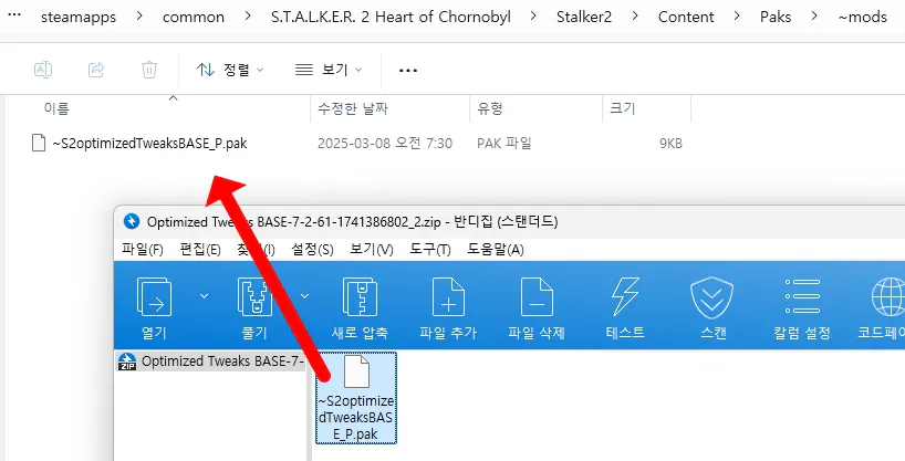 다운 받은 압축 폴더를 열고 ~S2optimizedTweaksBASE_P.pak 파일을 아래 경로에 넣어주시면 끝입니다! 🙂