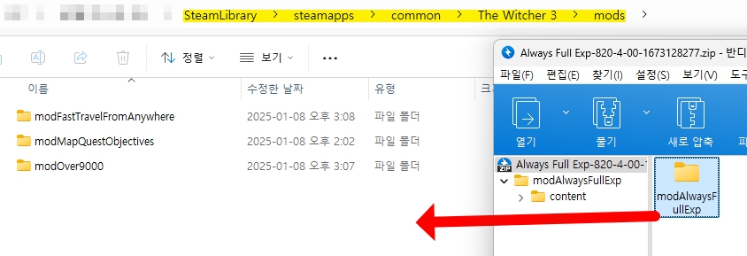 다운 받은 압축 파일을 열고 아래 경로에 modAlwaysFullExp 폴더를 넣으시면 끝이에요 🙂