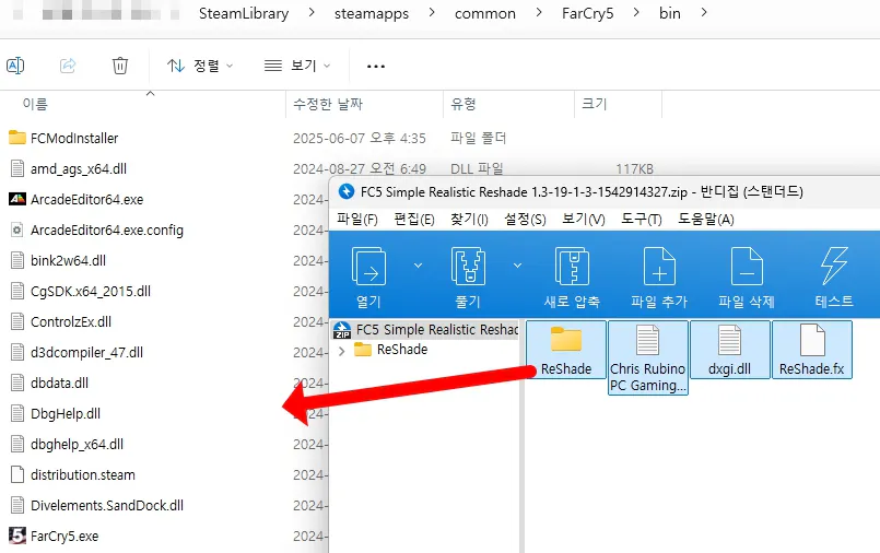 1. 다운 받은 압축 파일을 열고 ReShade 폴더와 dxgi.dll, ReShade.fx 파일을 아래 경로에 넣어주시면 적용 끝입니다.