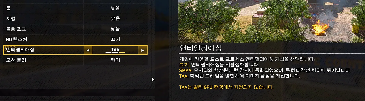 2. 게임에서 옵션 -> 비디오 -> 품질 -> 앤티앨리어싱을 TAA로 설정해주세요.