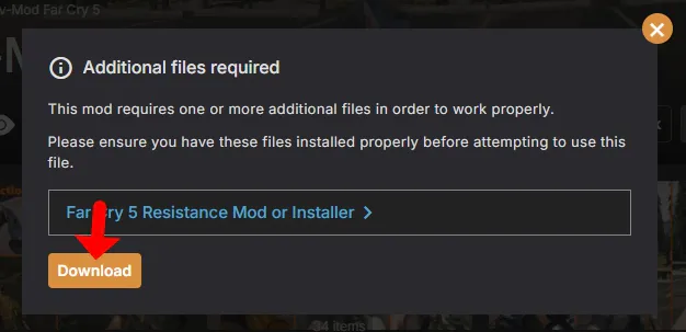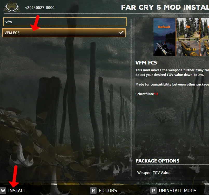2. 모드 인스톨러 프로그램을 실행하시고 상단 검색 창에 vfm 검색 -> VFM FC5 선택 후 하단에 INSTALL 버튼을 눌러주세요.