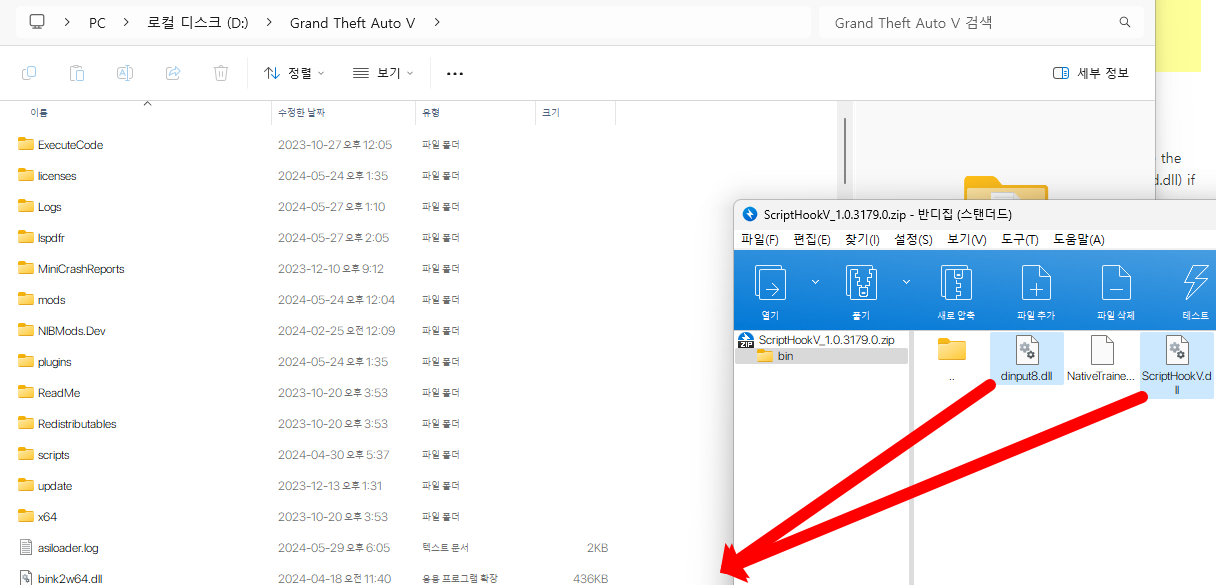 2. dinput8.dll, ScriptHookV.dll 파일 두 개를 GTA5 폴더 안에 넣어주시면 끝입니다!