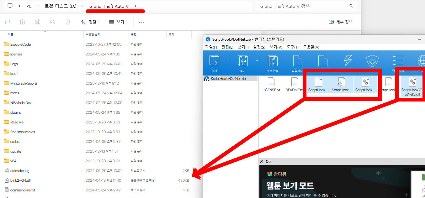 다운로드 된 압축 파일을 열어주시고 ScriptHookVDotNet.asi, ScriptHookVDotNet.ini, ScriptHookVDotNet2.dll, ScriptHookVDotNet3.dll 파일 4개를 GTA5 폴더 안에 넣으시면 끝입니다!